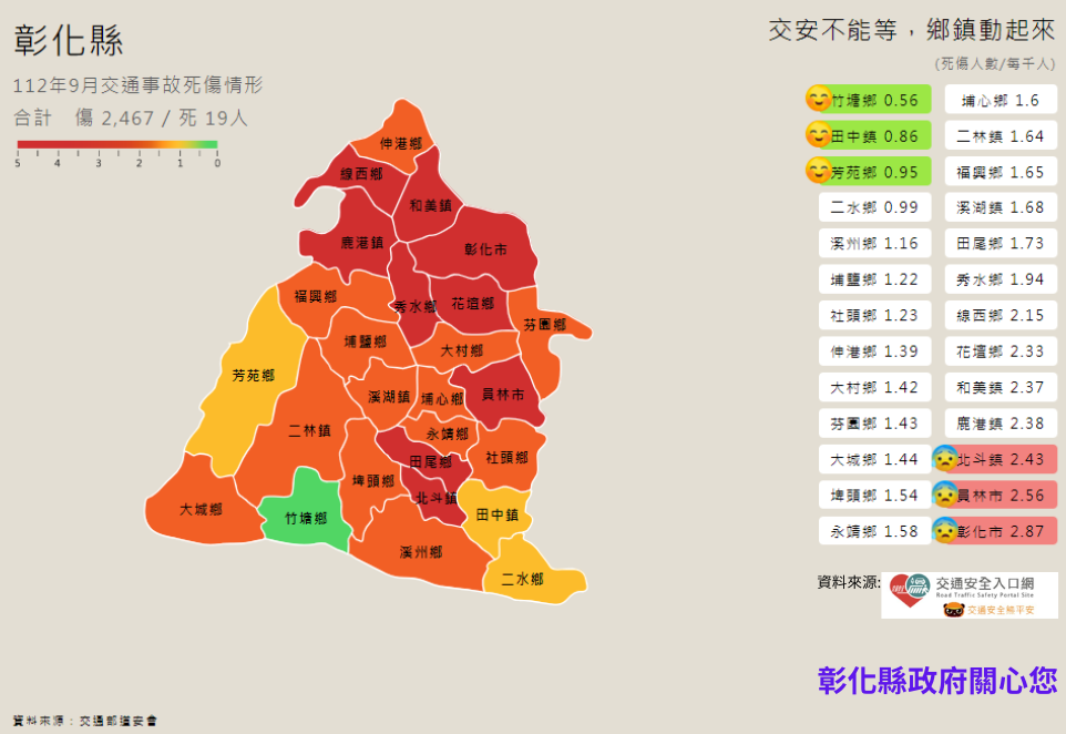 (一)112年1-9月道路交通事故死傷累計,遠離大型車,保持安全車距,彰化縣政府關心您。 (二)騎乘微型電動二輪車,請遵守交通規則。 (三)站在人行道上,離路口距離三大步的位置等紅燈才安全。